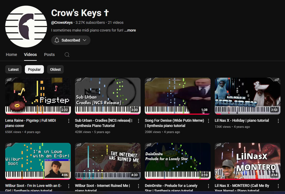 https://www.youtube.com/@CrowsKeysFor a few years I’ve remade some songs in MIDI and shared the files & videos publicly under the Crow’s Keys alias. I’ve analysed and transcribed a lot of songs for piano and it helped me get a better understanding in music, so it was a fun project, which I sadly had to end at some point because it became too time consuming and didn’t feel fulfilling anymore. Please check out the youtube channel if you’re interested ^^